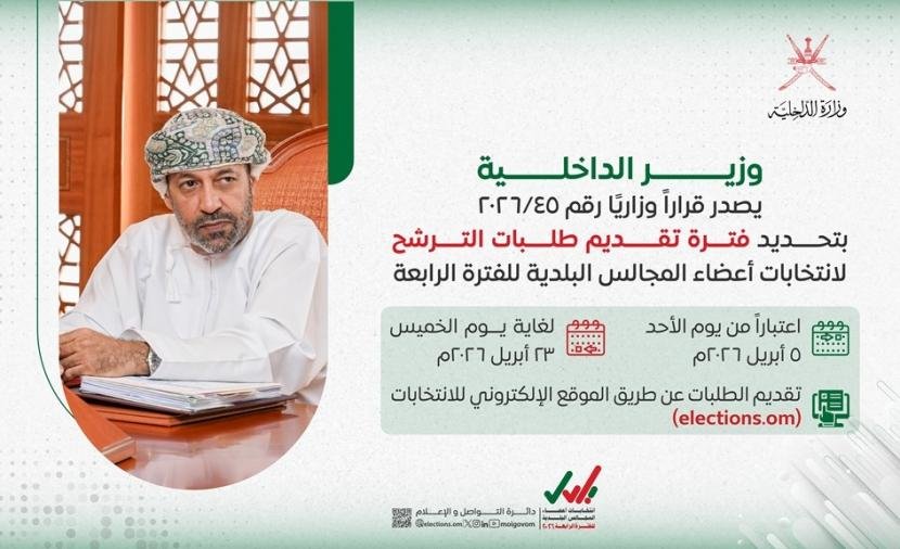أصدر معالي السيد حمود بن فيصل البوسعيدي وزير الداخلية القرار الوزاري رقم (45/2026) بتحديد فترة تقديم طلبات الترشح لانتخابات أعضاء المجالس البلدية للفترة الرابعة؛ وذلك اعتبارًا من يوم الأحد 5 أبريل ولغاية يوم الخميس 23 أبريل 2026، ويكون آخر موعد لسحب طلبات الترشح يوم الخميس 29 أكتوبر 2026.